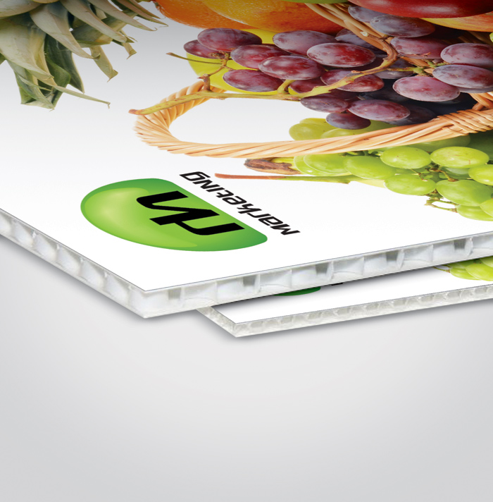 Als „Allroundtalent“ ist das Alu-DIBOND® Schild für fast jeden Einsatzzweck geeignet. Durch den Sandwichaufbau, bestehend aus einer weissen Aluminium Ober- und Unterschicht und einem Kunststoffkern, ist die Alu-DIBOND® Platte sehr biegsam. Dank der Korrosions- und Witterungsbeständigkeit wird die leichtgewichtige und stabile Verbundplatte gerne im Aussenbereich eingesetzt. Die weisse Oberfläche der Alu-DIBOND® Platte wurde speziell für den hochwertigen Digitaldruck optimiert.